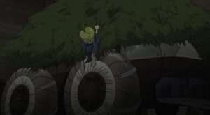 アマリリスが味方になり、女戦士・キリサメが石化武器を持っていると分かった千空達は、石化武器を敵から盗る作戦を準備します。まずは、コハクを後宮に選抜させるために、コハクを綺麗に大改造する計画をスタートさせます。コハクに科学のメイクアップ大作戦をするため、ペルセウス号のラボをゲットしようとしますが、ペルセウス号の生き残りは銀狼とスイカだけでした。コハクが大声で叫んだので、ラボが必要な事は伝わりましたが、ゲスの銀狼は逃げ隠れすることに精一杯です。果たして、スイカと銀狼のタッグでラボ奪還を出来るでしょうか?