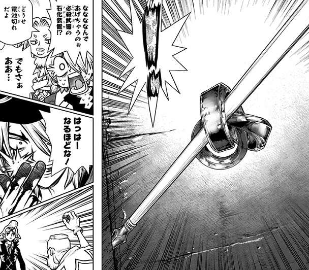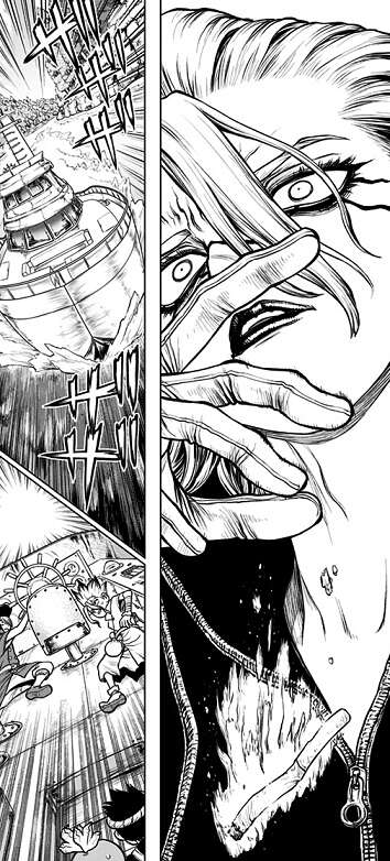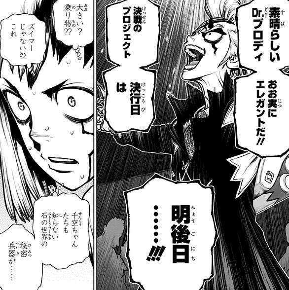 クロム達がドリルを完成させ地下トンネルを掘り進めている一方で、敵側のDr.ゼノもペルセウス号を攻めるための科学アイテムを完成させていました。それから二日後、スタンリーが飛行機に乗って再びペルセウス号を攻撃し、龍水と千空が改造した飛行機でスタンリーを迎撃します。