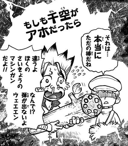 「Z=164 RE-LOCK ON」でドッグファイルとの時、千空はこちらにもマシンガンがあるとハッタリをかます為、ただの棒をマシンガンに偽装して飛行機に持ち込みました。そしてこれが千空がアホだったら、こうなるというイメージ図です。ただの棒を最強マシンガンと本気で信じてます、これじゃダメですね。