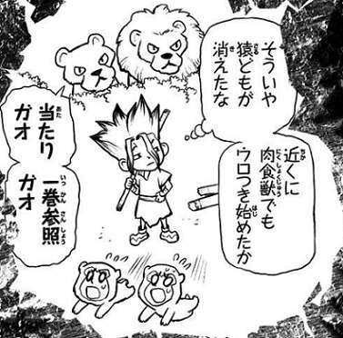 Z=13では千空の回りに猿がたくさんいましたが、Z=2、Z=3の時には、千空の回りには猿は見当たりません。これは既にZ=2やZ=3の時に、千空の近くにライオンなどの肉食獣がいたみたいですね。