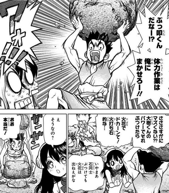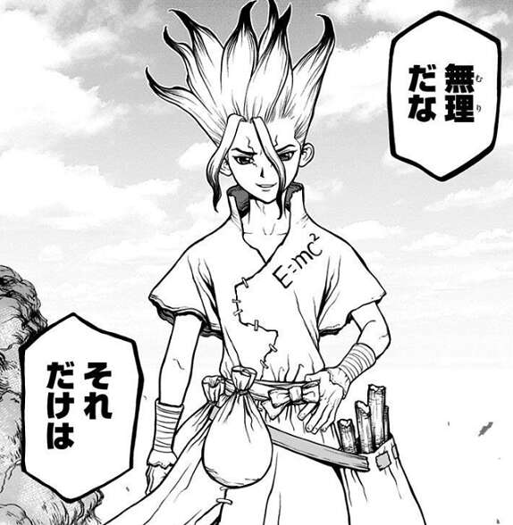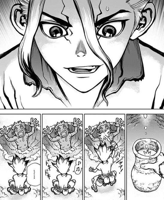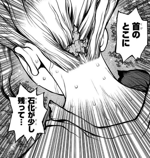 司から逃亡した大樹と杠は、千空の蘇生措置を施しますが医療も薬もないストーンワールド―では蘇生は難しく、蘇生措置は上手くいきません。大樹は杠から、千空が杠の代わりに犠牲になったと聞き、千空はむやみに自殺をしないと考え、千空には何か考えがあったと考え千空の体を調べます。すると、千空の首の後ろにまだ石化が少し残っている部分を大樹は見つけます。