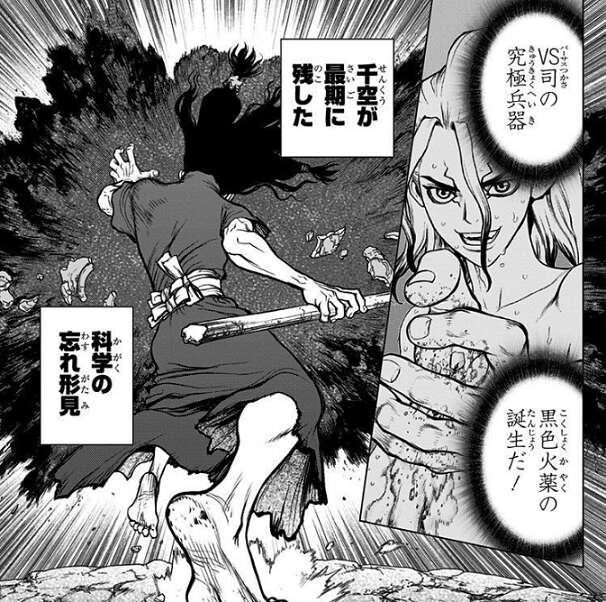 科学文明を永遠に捨てるとここで誓うように、千空は司から脅迫されますが、千空は子供の頃の父親との宇宙に行くという約束を思い出し、司の脅迫を頑なに拒絶します。司は千空が自分の脅迫に屈することはないと確信し、千空の頸神経を一撃で砕き殺害します。