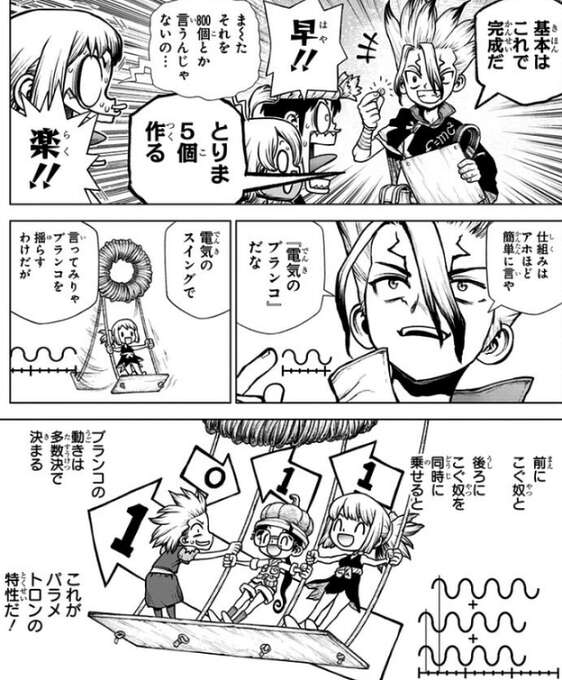 ストーンワールドでコンピューターを作ることにした千空達は、北米に向かい石化されている杠やジュエル達を復活させます。千空はまずは、コンピューターを作るためにパラメトロンを5個作るように言います。すぐに簡単なコンピューターは作れますが、千空はこれをたくさん繋げてパラメトロンスーパーコンピューターを作るため、石化から復活した杠達にパラメトロンを20万個作るように言います。