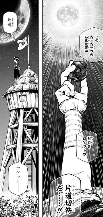 千空はロケットで月に行った後、ホワイマンと直接対決する三人のメンバーは地球には帰らず石化装置メデューサで自ら石化し、月面で救助を何百年と待ち続ける、という計画をみんなに発表します。これから作る月行きロケットが片道切符のロケットと知り、クロムは納得出来ずスイカと一緒に帰りのロケットを作ろうとします。