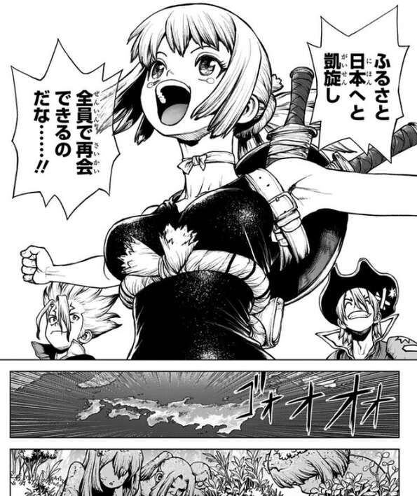 ロケットの事を何も知らないクロムとスイカは、SAIからのロケットの事を一から教えてもらい月を往復できるロケットを作ろうとします。ロケット作りの素材集めツアーは、最終目的地のインドネシアに到着し、無事ゴムの街を樹立します。そして、千空達は10年に及ぶ大冒険を終えてロケット作成のために、再び日本へと凱旋します。