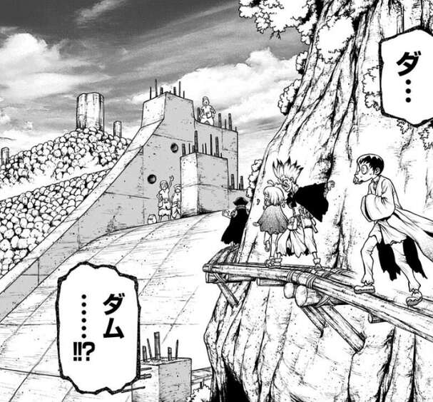 地球一周を遂げて日本に帰ってきた千空達は、石化している宝島や石神村の人々を石化復活液で復活させます。日本本土では千空が設計し、ルリ達が建設しているダムを使った水力発電所が完成しつつありました。この水力発電所を使ってロケット本体のアルミニウムを作り、ロケットを完成させます。