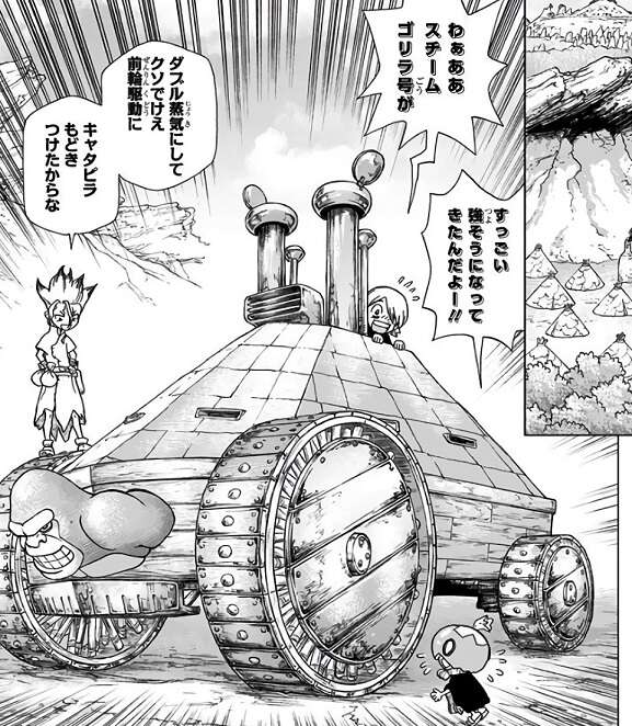蒸気自動車、スチームゴリラ号を手に入れた千空達は、村人たちからの申し出もあり、戦闘に向かない老人は村に残し、司帝国の本拠地の近く、陣を敷くのに有利な場所を目指します。スチームゴリラ号での移動は平地では問題ありませんが、上り坂ではパワーが足りず移動に苦労します。