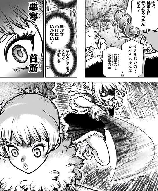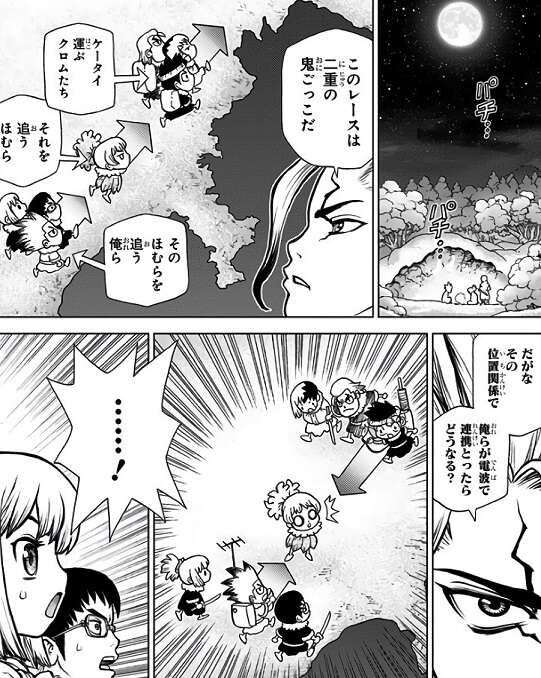 陽動に気付いたほむらはゲン達を追いかけますが、千空達はほむらにつけた青い光の目印とブラックライトを使って追跡します。ほむらはゲン達を追跡し、千空達はほむらを追跡する2重追跡の形になりますが、千空は携帯電話のベルを使ってゲンに連絡を取り、挟み撃ちを仕掛けます。