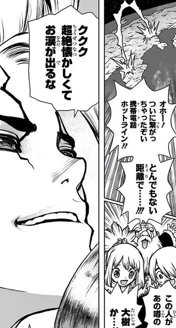 ついに司帝国の本拠地に着いたゲン、クロム、マグマの三人は、受け渡し場所の千空の墓に携帯電話を埋めます。大樹、杠は千空の墓に墓参りに来た時に、何かが埋めてあるのに気づき、携帯電話を掘り起こし千空の名を叫びます。千空と大樹の二人は、ようやく一年ぶりに携帯電話経由で会話をすることに成功します。