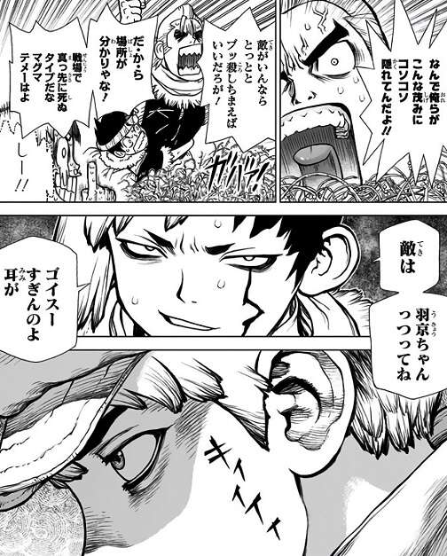 携帯電話で千空と話した大樹は、司帝国の中から誰か一人を連れてくるように言われます。千空は詳細を話しませんでしたが、大樹は千空を信頼し千空の提案に従います。一方、司帝国の羽京に見つかってしまったゲン達はですが、クロムとマグマが囮になることでゲンのみ逃げすことに成功します。しかし、その代わりクロムとマグマが羽京の攻撃に晒されます。