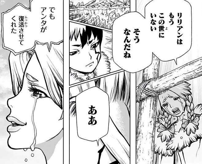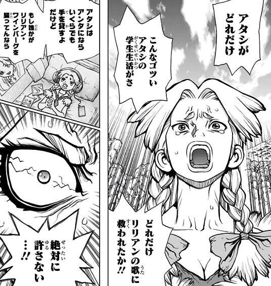 マニアックなリリアンに関するクイズで、携帯電話越しの相手でリリアン本人でないとニッキーは見破ります。ゲンはそれでもリリアン本人と誤魔化そうとしますが、千空はレコードを再生し、レコードでリリアンの歌を再生しハッタリより科学の力に掛けます。