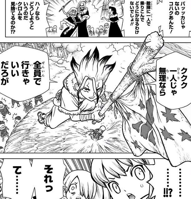 千空は大量の化学グッズを運搬するため、自動車を作ろうとします。動力は暖炉を流用し蒸気機関を作り、蒸気自動車を作成します。一方、捕縛されたクロムは司達から、クロムの首を差し出すように脅されます。しかし、クロムは脅しには屈せず滝壺に落とされることを自ら選びます。