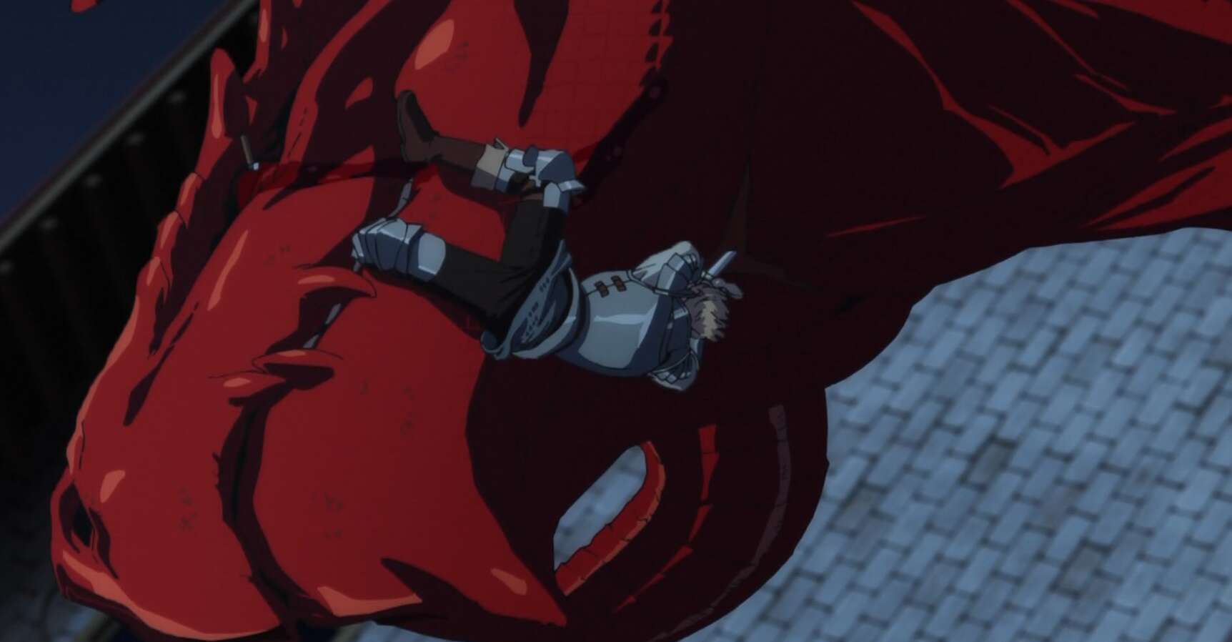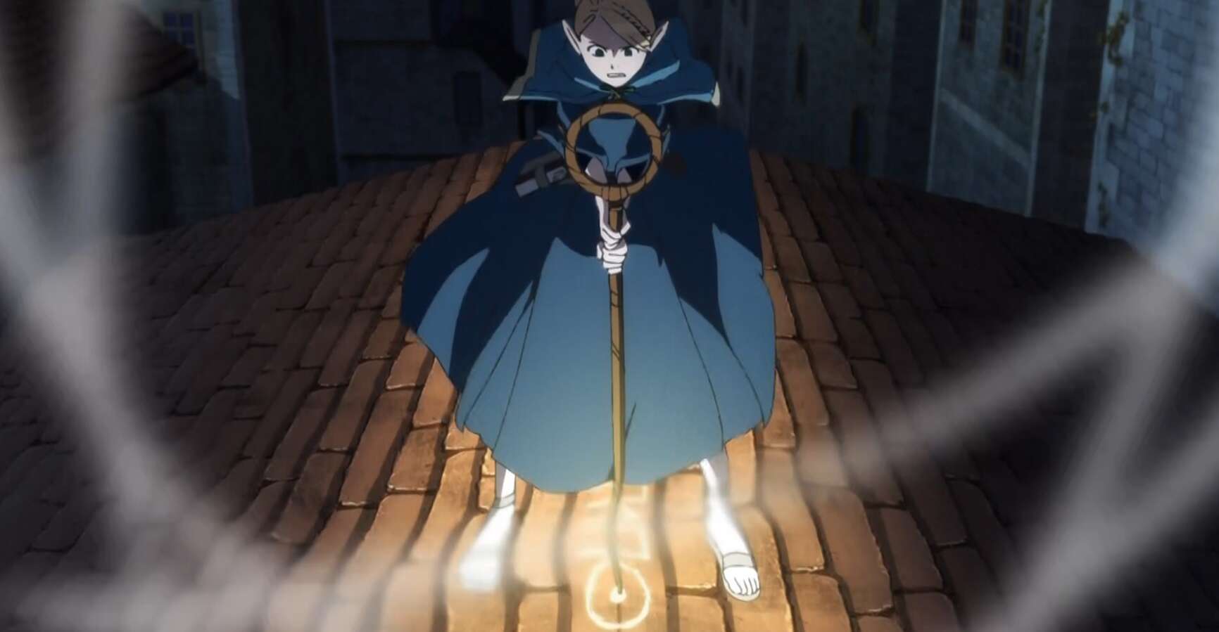 マルシルは事前に立てた作戦通りに、建物の間にまたがる橋を壊す魔法陣を準備します。作戦では、建物の間にまたがる橋の真下をレッドドラゴンが通る瞬間、この魔法陣を発動させて壊し、レッドドラゴンを下敷きにする予定です。