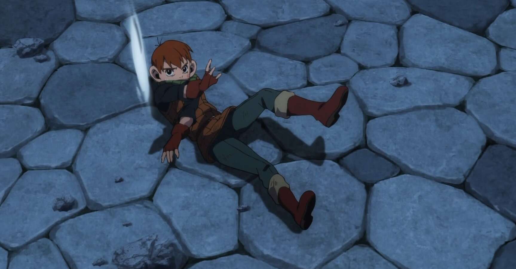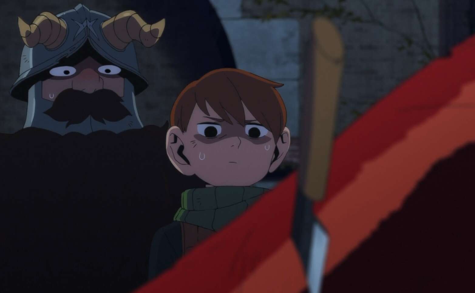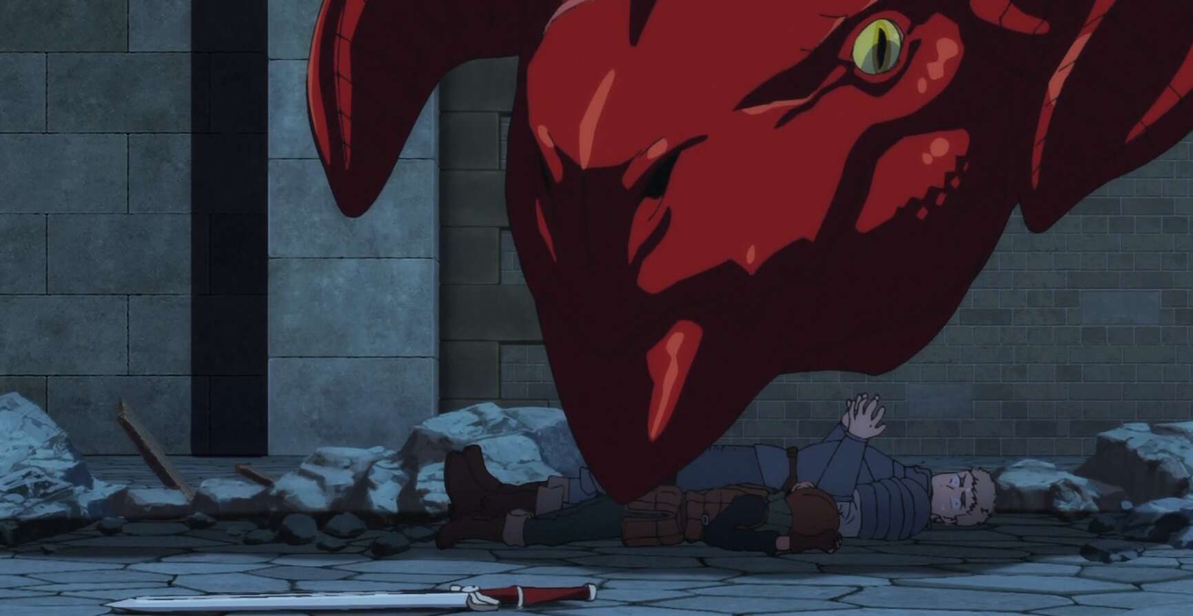 レッドドラゴンは瓦礫の下敷きになったものの、全く効いておらず瓦礫を押しのけて再び動き出します。さらにケン助もレッドドラゴンにビビって勝手に逃げ出してしまい、ライオスは武器を失ってしまいます。レッドドラゴンは再びライオス達に襲い掛かろうとし、ライオス達はレッドドラゴンの腹部に潜り込んで攻撃をかわします。チルチャックはライオスの武器が魔物だと分かり、レッドドラゴンから逃げながらライオスを罵倒します。
