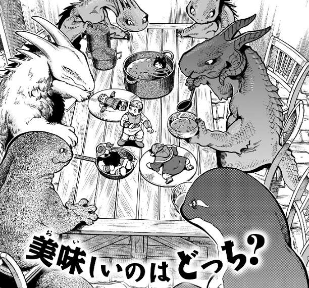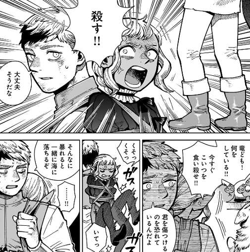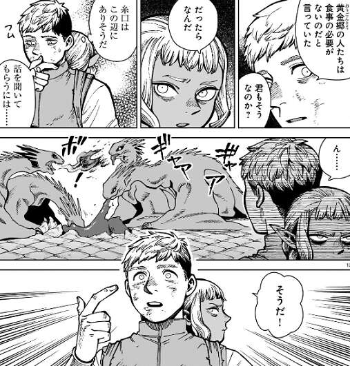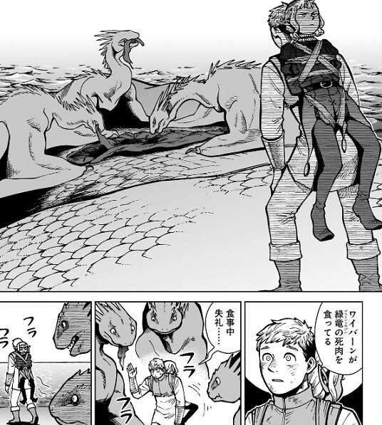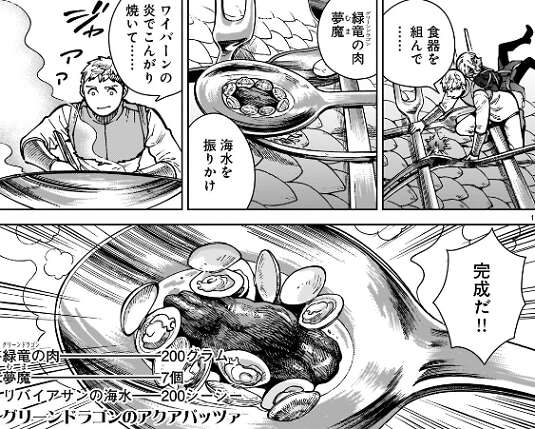 ワイバーンの食べているグリーンドラゴンの肉を分けてもらおうとしますが、ワイバーンはライオスに炎を吐いて攻撃します。しかし、背中に縛り付けているシスルを見せると、ワイバーンは炎を当たらないように、とっさに避けます。グリーンドラゴンの肉、夢魔を銀のスプーンに乗せ、海水を振りかけ、さっき吐いたワイバーンの炎でこんがり焼いて、グリーンドラゴンのアクアパッツァを完成させます。
