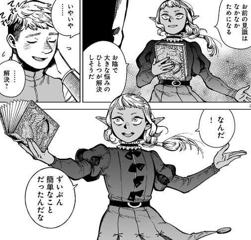 シスルの魔術書を鍋敷に銀のスプーンを置き、ライオスはシスルに一緒に食べようと言います。ライオスはグリーンドラゴンの肉を食べますが、妙な風味がするようではっきり言ってまずいようです。シスルにも一口食べさせますが、煙突の中みたいな味がすると言われてしまいます。