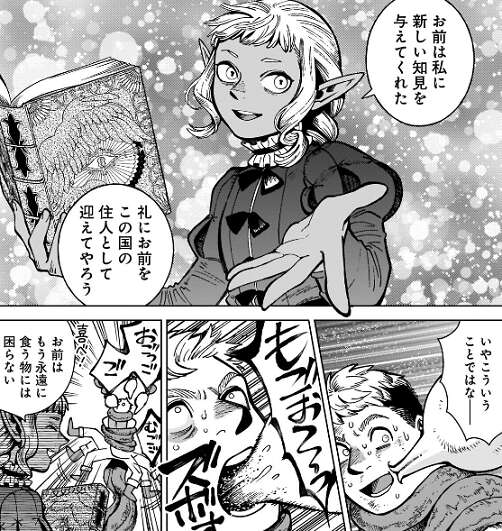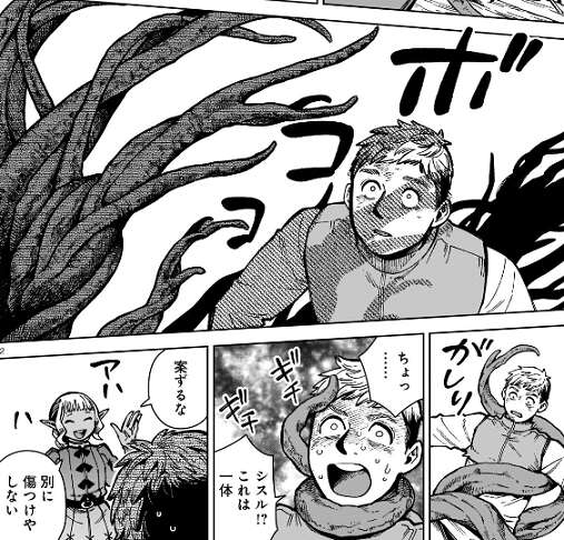 新しい知見を与えてくれた、礼にお前をこの国の住人として迎えてやろう、とシスルは言うと、ライオスの口に強引に植物を突っ込み、どろっとした液体を無理やり流し込みます。ライオスは、永遠に、永遠に飯をー!!?と、心の中で思い焦りますが、植物に拘束され身動きが取れません。