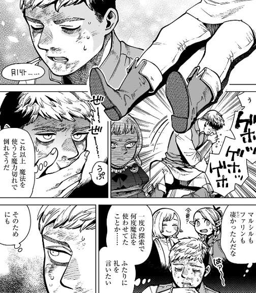 何とかシスルを拘束したライオスですが重傷で、魔法で治癒を行います。しかし、ライオスの魔力ではあまり傷を治癒することは出来ません。マルシルとファリンが凄かったと実感しつつも、皆の遺体と翼獅子の本を海底に沈む前に回収しなければと考えます。