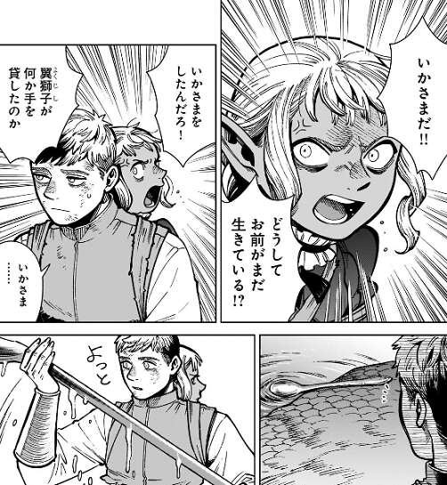 ライオスが銀のスプーンを使ってマルシルの遺体を引き寄せようとしていると、背中のシスルが、いかさまだ!!どうしてお前がまだ生きている!?と、激怒します。ライオスは前回、ワームの毒霧や大爆発で死んだはずですが生きているので、シスルが何か翼獅子の手を借りていかさまをしたのだろう、とライオスに文句を言います。ライオスは、ワームの毒霧とホワイトドラゴンのブレスは、2発目なので多少薄まっていて即死の可能性は薄いと考えたようです。