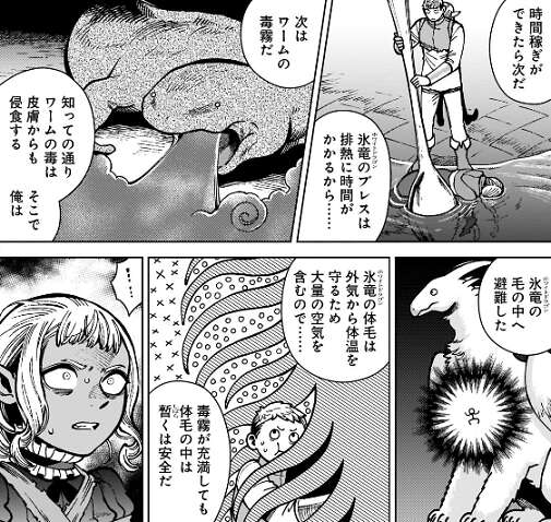 逆にレッドドラゴンのブレスは絶対に避けたかったので、ケン助をレッドドラゴンの逆鱗に投げつけてレッドドラゴンの気を引いてブレスを避けたようです。そしてワームの毒霧はホワイトドラゴンの毛の中へ避難することで、ライオスは毒霧をやり過ごしていました。