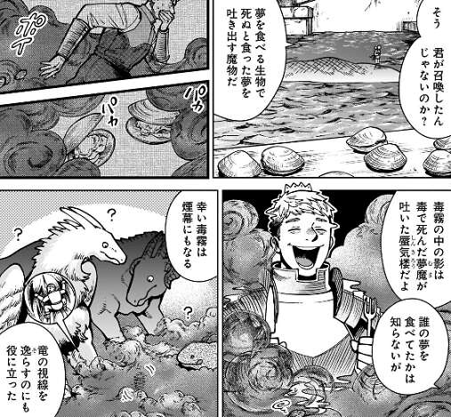 嘘をつくな!!とシスルは言い、レッドドラゴンが炎を吐く直前、確かに毒霧の中にいた、と言いますが、あれは夢魔の吐いた幻だよ、とライオスは答えます。毒霧の中にいた影は毒で死んだ夢魔が吐いた蜃気楼でライオス本人でなく、さらに毒霧は煙幕にもなり竜の視線を逸らすのにも役立った、とライオスは言います。