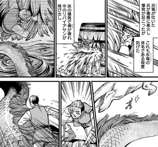 レッドドラゴンが吐いた炎で大爆発が起きた際も、ライオスはホワイトドラゴンの毛に避難していたので、ある程度大爆発を防げたようです。その後、樽が壊れてリバイアサンが飛び出した時、ライオスはホワイトドラゴンからシスルの乗っていた東洋龍に飛び乗ります。そして東洋龍の体を伝ってシスルの元まで行き、シスルを拘束しました。