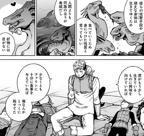 ライオスは、ライオスが今話した竜たちの性質ひとつでも知っていれば、シスルは何度でもライオス達を全滅させることができた、と言います。そして、君がもう少し生きているものに興味を向けていれば、少なくともファリンに十分に食事を与えていれば、俺なんかとっくに殺せていた、とライオスがシスルに話すと、シスルはおとなしくなり、……なるほど、と納得します。