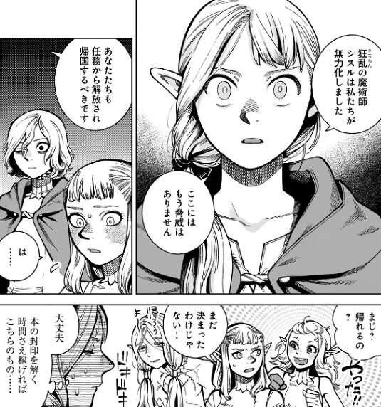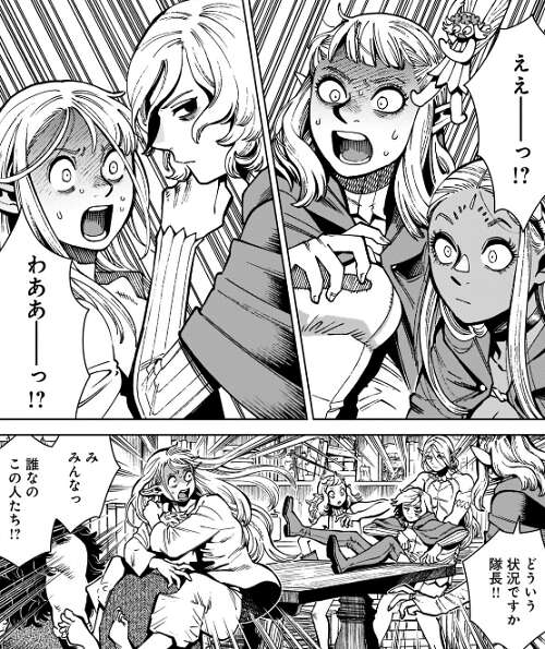 ところが、ミスルンが転移術を使ったことでマルシルの魔法は外れて、マルシルとミスルンはライオス達が幻覚術で取り調べられてる場所に転移します。急に現れたマルシル達に驚くパッタドル、そしてマルシルも転移術の事を知らないので急に現れたパッタドル達に驚いています。
