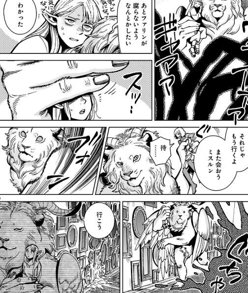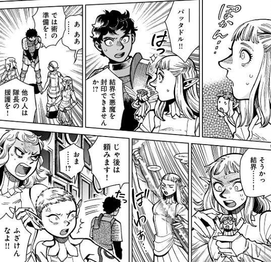 ミスルンの攻撃で翼獅子の体は切られていきますが、切った端から再生していきます。その様子を見ていたカブルーは、このままじゃミスルンが先に魔力切れで倒れてしまうと思い、パッタドルに結界で悪魔を封印できないか、と聞きます。そして他の人にはミスルンの援護を頼み、カブルーはどこかに去って行ってしまいます。