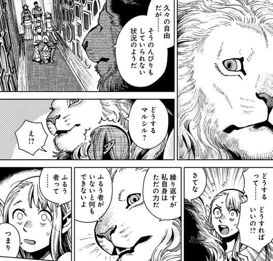 そして、私が迷宮の主になるから、今すぐ私の願いを叶えなさい!!と、マルシルは叫びます。それを聞いて翼獅子は頭がない状態で、素晴らしい!と、つぶやきます。