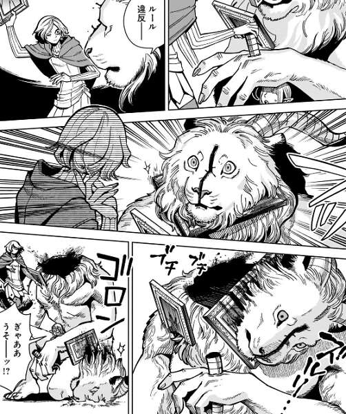 彼女はまだ一介の冒険者だぞ、ルール違反、と翼獅子はミスルンに言いますが、ミスルンは聞く耳を持たず翼獅子の首を落とします。さらにミスルンは、マントを転移させて翼獅子の体を削っていきます。