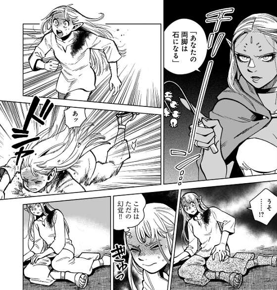 マルシルは幻覚を見抜いてさらに逃げようとしますが、ミスルンは地形が変化した物を転移させてマルシルの腹を貫きます。ミスルンは転移術でマルシルのすぐ傍まで転移し、マルシルに諦めるように言います。ミスルンに殺されるか、どこかに飛ばされる、とマルシルは死を覚悟します。