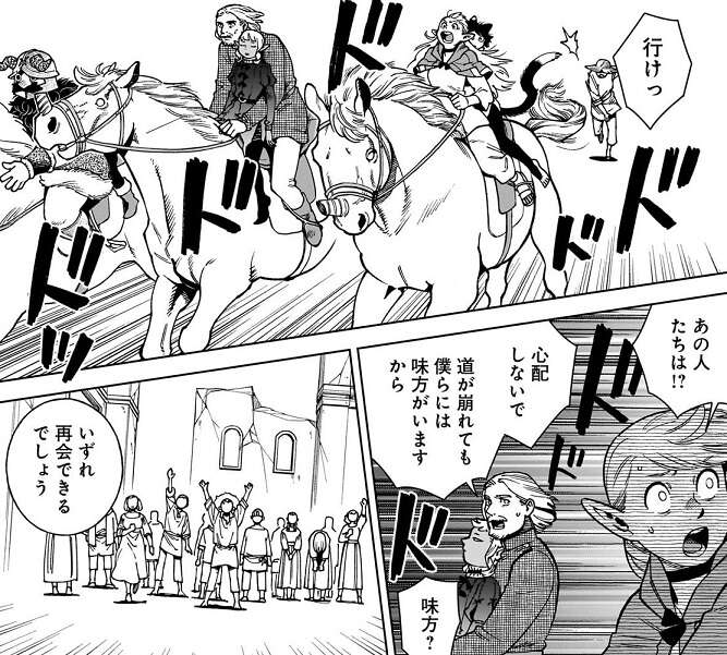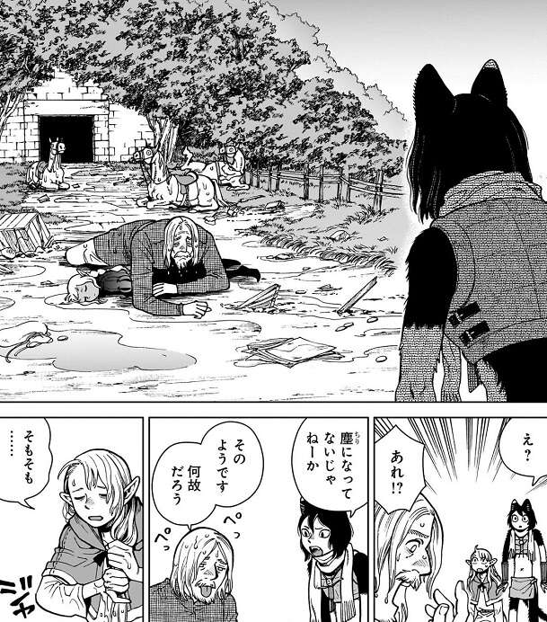 迷宮の入り口から水と一緒に吐き出されたマルシル達ですが、一応無事のようです。さらにヤアドやシスルも塵にならず無事でした。どうやら、翼獅子が迷宮から地上に出た時に、地上との境目が消えて、翼獅子が去っても迷宮の力の影響はすぐに失われるわけではないようです。しかし、この先ヤアド達がどうなるかは分からず、徐々に塵になっていくとか……?と、マルシルは予想します。