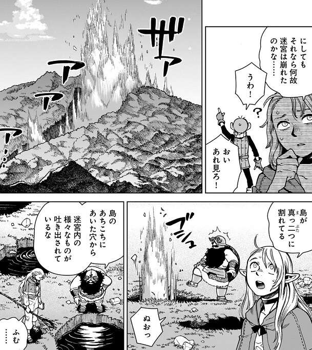 にしても迷宮の力の影響がすぐに失われないなら、何故迷宮は崩れたのかな……、とマルシルが疑問に思っていると、チルチャックが何かを見つけます。どうやら島が真っ二つに割れて、出来た裂け目や島にあいた穴から様々なものが吐き出されているようです。