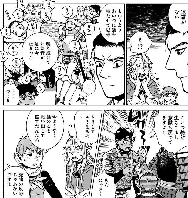 その時、シュローがライオスに渡した鈴の片割れを出すと、鈴がチリンチリンと鳴ります。どうやらライオスは既に意識を取り戻して、今は歩いているようで、シュローは鈴を使ってライオスに呼びかけます。しかし、ライオスから返事はありません。チルチャックは、ようやくライオスは鈴のことを思い出して慌てて鈴をどうにかした、と予想します。怒りの収まらない皆は、絶対にライオスを探し出し一発殴る、と言い、ライオスを探し始めます。