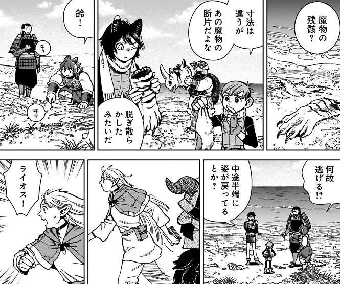皆で手分けしてライオスを捜索すると、チルチャックが海岸線に魔物の残骸を見つけます。寸法は違いますが、魔物のライオスの断片で間違いないようで、さらにシュローがライオスに渡した鈴も見つかります。