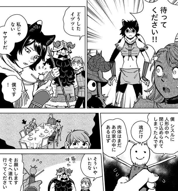 迷宮全体が崩れ始め、このままでは巻き込まれると魔物のライオスは置いておいて、マルシル達は地上に逃げることにします。すると、人形の中に魂だけ閉じ込められていたヤアドが、待ってください!!と、叫びます。肉体がまだシスルの家にあるはずなので、そこまで連れて行って欲しい、とマルシル達にお願いします。