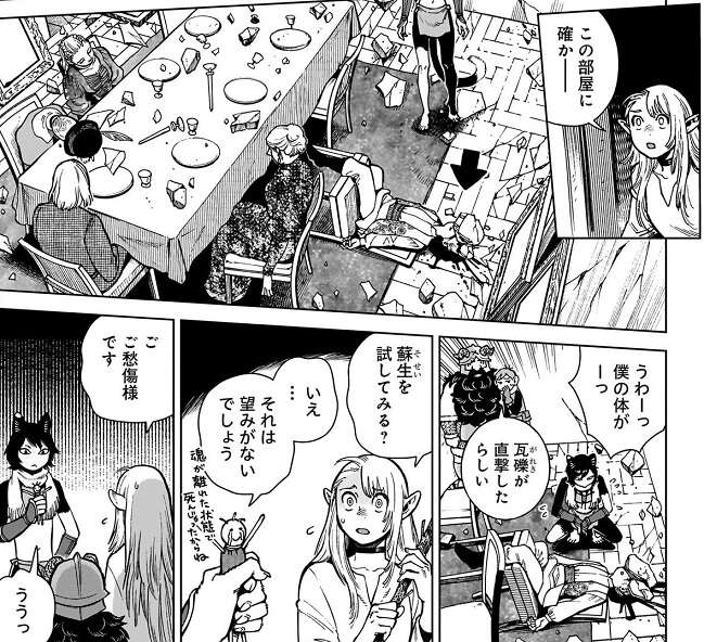体があればマルシル達を迷宮を案内できるとヤアドに言われ、マルシル達はヤアドの体を探しにシスルの家へと向かいます。しかし、ヤアドの体は瓦礫が直撃していて、魂を入れるのは無理な状態でした。蘇生も魂が離れた状態で死んでしまったので無理なようで、ヤアドは祖父のデルガルの肉体を借りることにします。