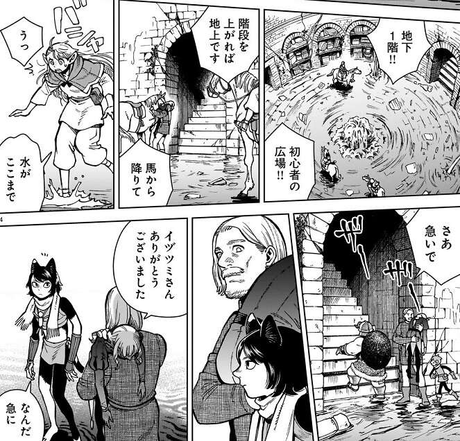 センシがイヅツミを連れて行こうとした瞬間、地下1階の初心者の広場は水に呑み込まれてしまい、マルシル達は溺れてしまいます。