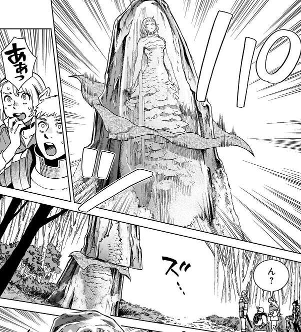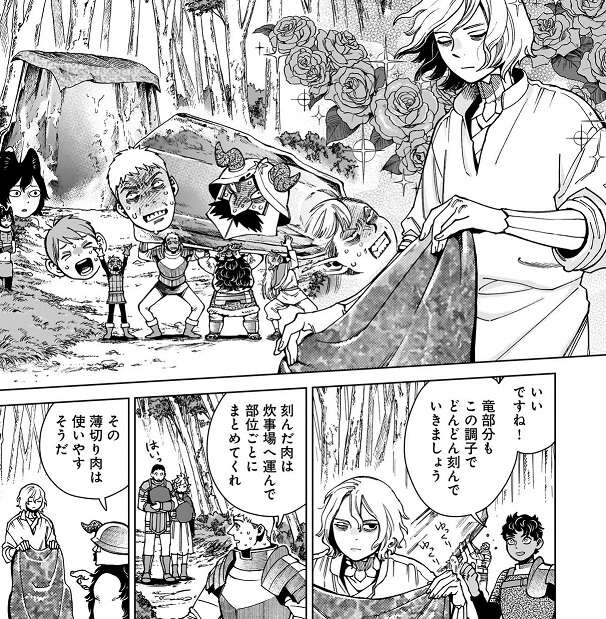 ライオス達は必至の形相で氷漬けになったファリンを受け止めますが、その後ろではミスルンが涼しい顔をしており、イヅツミはその様子をあきれながら眺めます。カブルーはこの調子でどんどん竜部分を刻んでいこうと言い、刻んだ肉は炊事場へ運んで部位ごとにまとめるように、ライオスはドニとフィオニルに頼みます。人間の部分は、食べ終わるまで涼しい所に安置することにし、フラメラは氷が解けないように氷術が得意な者に力を貸してやるようにパッタドルに指示します。
