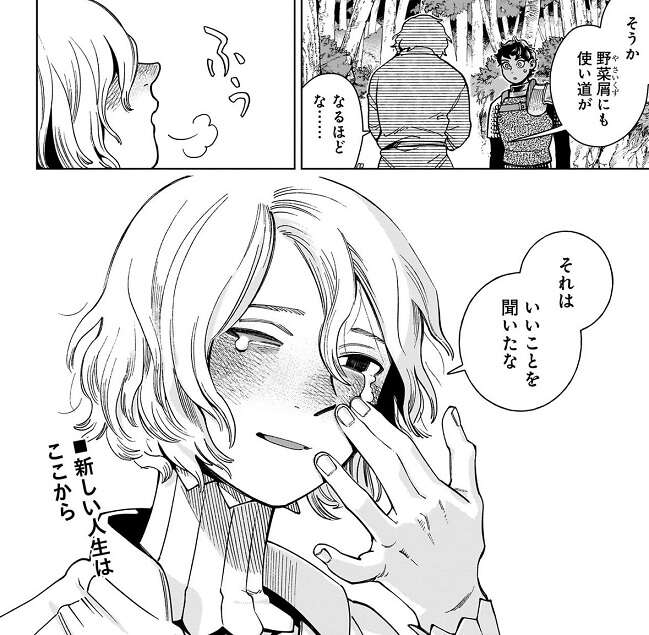 センシが話を終えて去った後、ミスルンは突然笑い始めます。野菜屑にも使い道があると分かりミスルンは一人で納得すると、それはいいことを聞いたな、と涙を流しながら笑顔でつぶやきます。