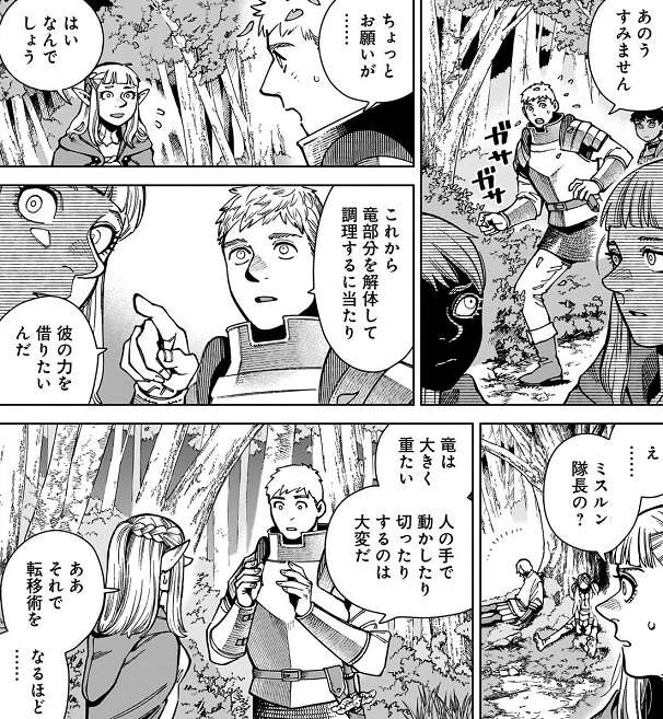 前回の記事はこちらです。ライオスは皆と協力してファリンの竜部分を食べようと、調理の準備を始めます。