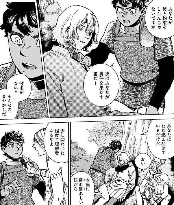 カブルーはミスルンに欲求は尽きる事はないと思う、と言い、今自分が考えている事を一つずつミスルンに話します。竜の肉はできればあまり食べたくない、とカブルーが言ったところで、ライオスには意外だったのか、えっ、ライオスは驚きます。それでもカブルーは話を続けて、厄介なことに生きてる限り欲求は生まれ続けるもんだとミスルンを説得すると、ミスルンの指が少し動きます。