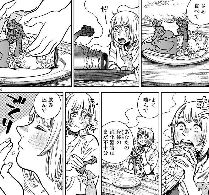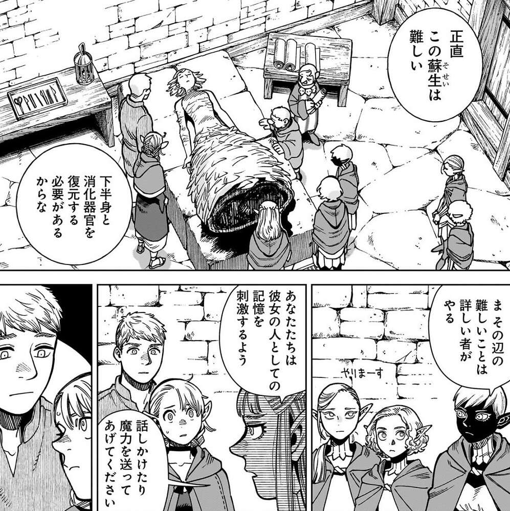 もちろん、ライオスはファリンの蘇生を試しますが、下半身と消化器官を復元する必要があり、ファリンの蘇生は難しいようです。その辺はカナリア隊の詳しい者がやってくれるようで、ライオスとマルシルにはファリンの人としての記憶を刺激するように言います。そして、ライオスとマルシルはファリンに話しかけます。