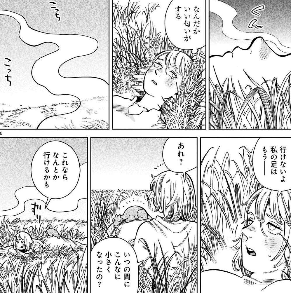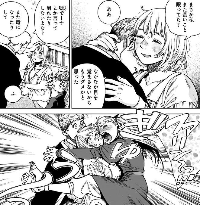 一方、夢の中のファリンはいい匂いに誘われますが、ファリンは下半身を巨大な竜に押さえつけられていて行く事が出来ません。行けないよ 私の足はもう…、とファリンは言いかけますが、いつの間にかファリンの下半身についている竜はかなり小さくなっていて、これなら何とか行けるかも、とファリンは匂いがする方にはって進みます。その内、ファリンは食欲が出てきたのかいつの間にか立って進もうとしますが、ファリンの下半身についていた小さい竜が落ちてしまいます。ファリンは小さな竜を拾うと、走って匂いのする方に進みます。