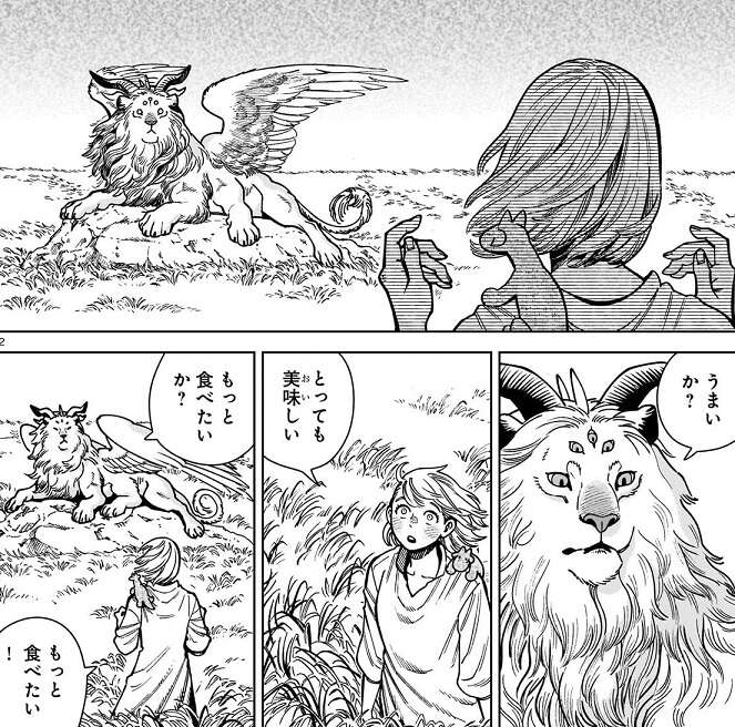 それを食べきると、いつの間にか目の前に翼獅子がいました。翼獅子は、うまいか?と、ファリンに聞き、とっても美味しい、とファリンは答えます。翼獅子が、もっと食べたいか?と、聞くと、もっと食べたい!と、ファリンは答えます。