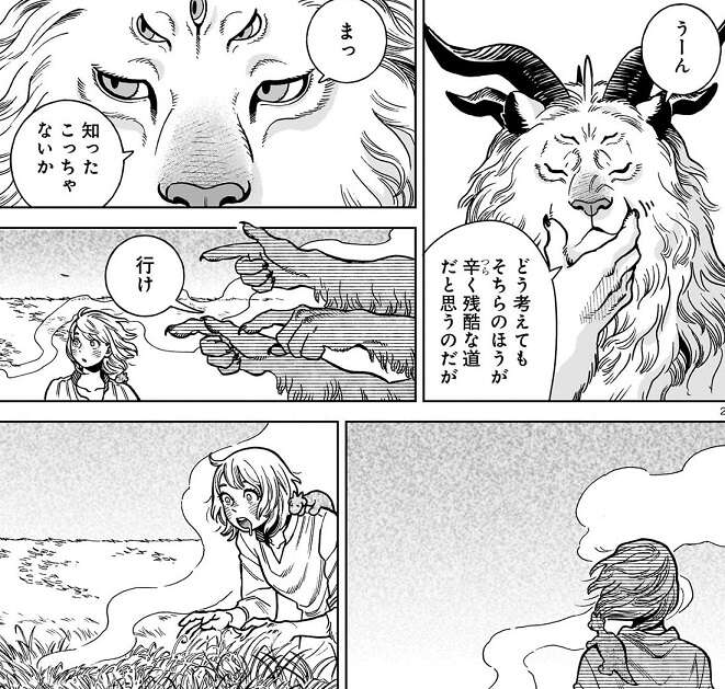 そちらのほうが辛く残酷な道だと思うのだが、まっ、知ったこっちゃないか、と翼獅子はつぶやくと、ファリンに行けと言います。翼獅子が指さす先、匂いのもとにある物をファリンが掴むとファリンはベッドの上で目を覚まします。