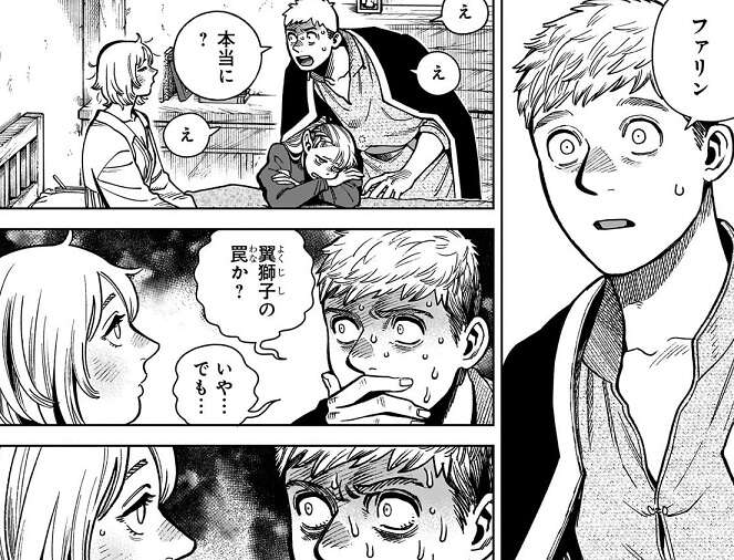 ファリンのそばではライオスやマルシルが寝ていて、ライオスは目を覚ますとファリンが起きている事に気付きます。ファリンが目を覚ましたことを信じられないライオスは、翼獅子の罠ではないかと疑いなます。