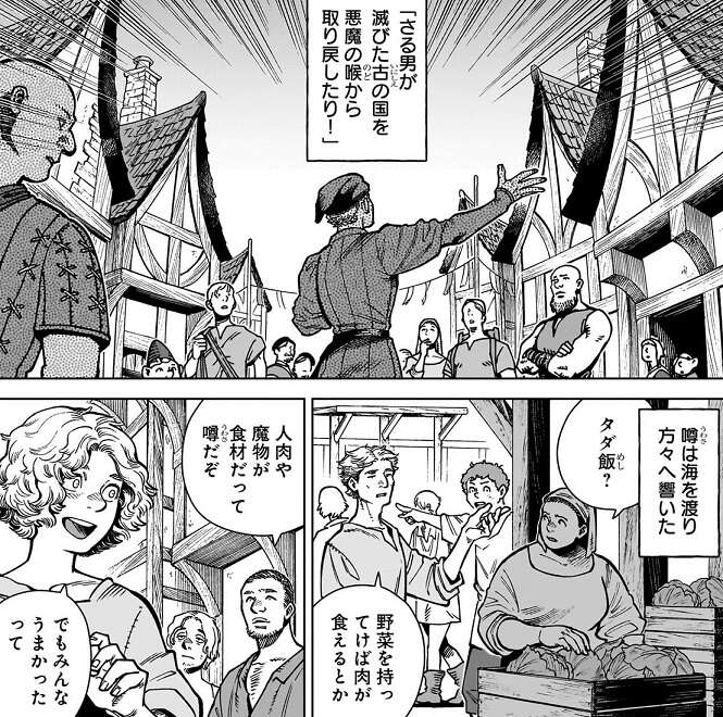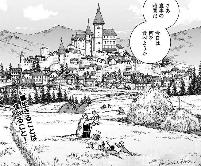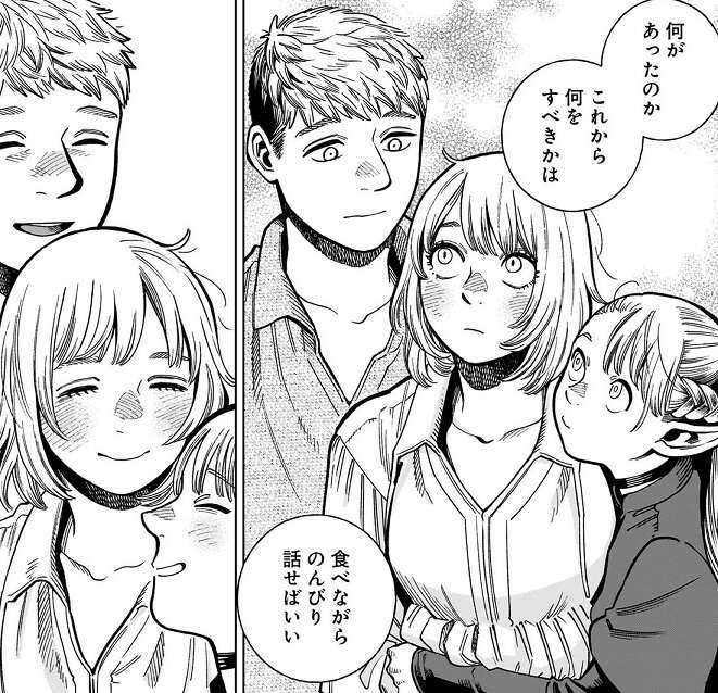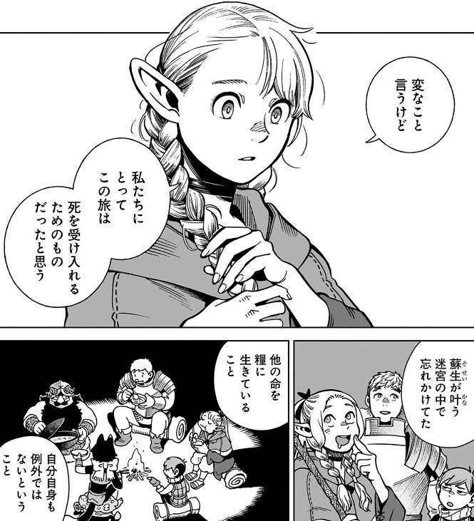 王国の子供が、なぜそこまで食料にこだわるのか、尋ねたところライオスは、食は生の特権だ、生きる為には生き続けなくてはならない、と子供に答えたそうです。そして、ライオスは子供達を食事に誘ったところで、ダンジョン飯の物語は終わりです。