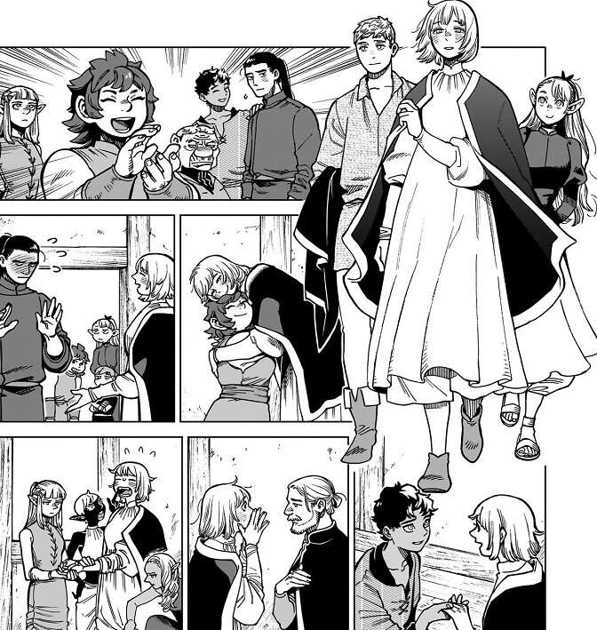 ファリンの足は若干、竜部分が残っていますが、ファリンは気に入ったようで、すごくいい、とつぶやきます。竜が残った足をすごくいいと言うファリンに、二人は抱きつきながらツッコみます。そこにチルチャック、センシ、イヅツミも現れて、ライオスはファリンにみんなを紹介します。